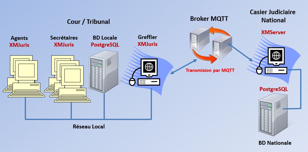 Le système XMJuris de gestion électronique du casier judiciaire est un système Client/Serveur reposant sur une plateforme MQTT. Il comprend :