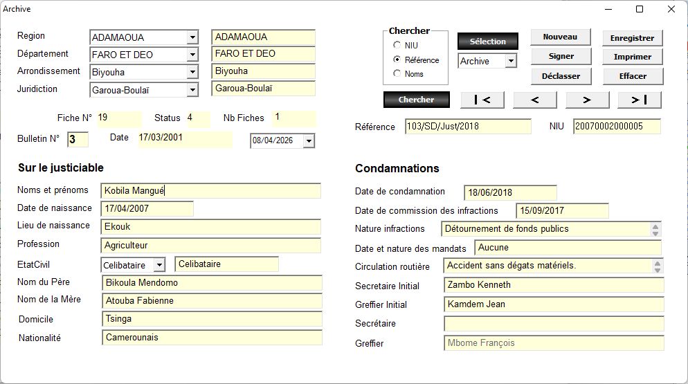 Les cours et tribunaux accèdent tous au Casier Judiciaire National (CJN) où ils archivent leurs arrêts et font des extraits du Casier Judiciaire.